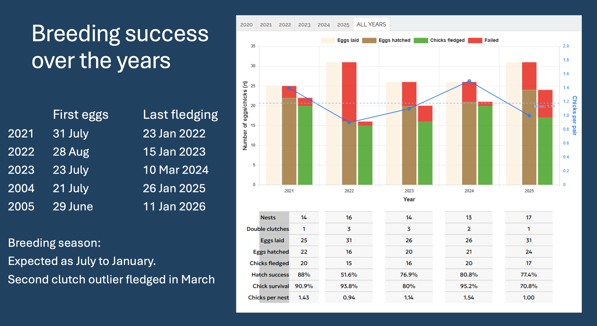 The graph below shows our records for the last five breeding seasons.